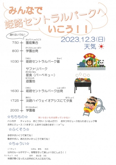 恵愛学園に入所する子ども達と職員の皆さん合計51名で、姫路セントラルパークに行き、サファリパークや遊園地、昼食にバーベキューを楽しんだそうです。子ども達の元気な声が聞こえてきそうな報告書をいただきました。